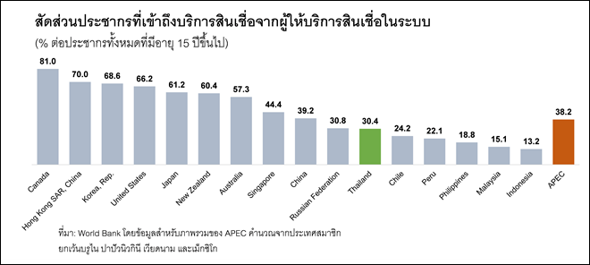โดยสรุปแล้ว ในมิติของการเข้าถึงบริการทางการเงิน อันเป็นองค์ประกอบสำคัญต่อการสร้างการเติบโตแบบมีส่วนร่วม (Inclusive Growth) นั้น แม้ว่าไทยจะโดดเด่นกว่าหลายประเทศใน APEC ในมิติของการเป็นเจ้าของบัญชีทางการเงิน การมีเงินออม รวมถึงการทำธุรกรรมทางดิจิทัล แต่ไทยยังคงต้องเดินหน้าส่งเสริมการเข้าถึงบริการด้านสินเชื่อ เพื่อให้ประชากรกลุ่มที่มีข้อจำกัดในการเข้าถึงสินเชื่อ อาทิ จากปัญหารายได้ไม่เพียงพอหรือไม่ประจำ และการขาดความรู้ ได้รับสินเชื่อในระบบที่มีอัตราดอกเบี้ยต่ำกว่าการหันไปพึ่งพิงสินเชื่อนอกระบบ รวมถึงมีเงื่อนไขของสินเชื่อที่ดีกว่าเดิม อันจะนำไปสู่การต่อยอดการลงทุนเพื่อเพิ่มโอกาสทางอาชีพและยกระดับคุณภาพชีวิตในอนาคต