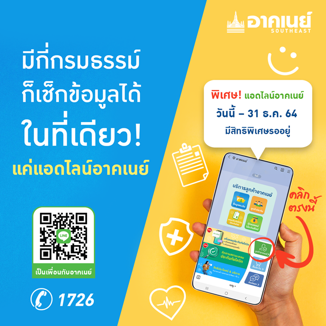 สำหรับลูกค้าที่สนใจสามารถแอดไลน์อาคเนย์ Line @Southeast.th และคลิกไปที่เมนูลูกค้าปัจจุบันและเลือกข้อมูลของฉัน เพื่อลงทะเบียนใช้งาน จากนั้น ลูกค้าจะสามารถเช็กข้อมูลกรมธรรม์ของตัวเองได้แบบง่าย ๆ ตั้งแต่ ประกันชีวิต ประกันภัย ประกันรถยนต์ ประกันอัคคีภัย ประกันสุขภาพ ประกันโควิด-19 และประกันไข้เลือดออก เป็นต้น ตลอดจน สามารถสอบถามข้อมูลกรมธรรม์ใหม่ ๆ ที่น่าสนใจ พร้อมตรวจสอบสิทธิ์ในการกู้เงินกรมธรรมประกันชีวิตออนไลน์ นอกจากนี้ ยังสามารถค้นหารายชื่อโรงพยาบาล และอู่ซ่อมรถยนต์ในเครือได้ทั่วประเทศ พร้อมรับสิทธิพิเศษมากมายผ่านแอปพลิเคชัน S Plus+ เพื่อให้บริการแบบครบวงจรครอบคลุมทุกไลฟ์สไตล์