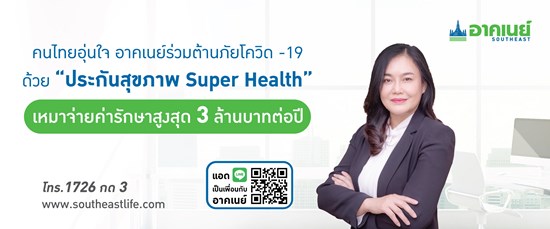 อาคเนย์ประกันชีวิต หนึ่งในสายธุรกิจหลักด้านประกันและการเงิน บริษัท เครือไทย โฮลดิ้งส์ จำกัด (มหาชน) ห่วงใยลูกค้าเดินหน้าเปิดตัวผลิตภัณฑ์สัญญาเพิ่มเติม “Super Health” (ซูเปอร์ เฮลท์) คุ้มครองสุขภาพแบบเหมาจ่าย ด้วยเบี้ยสบายๆ รักษาได้ไม่จำกัดครั้ง คุ้มครองสูงสุด 3 ล้านบาทต่อปี ปลดล็อคทุกความกังวลเรื่องค่ารักษาพยาบาลในภาวะการแพร่ระบาดของไวรัสโคโรน่า(โควิด-19)