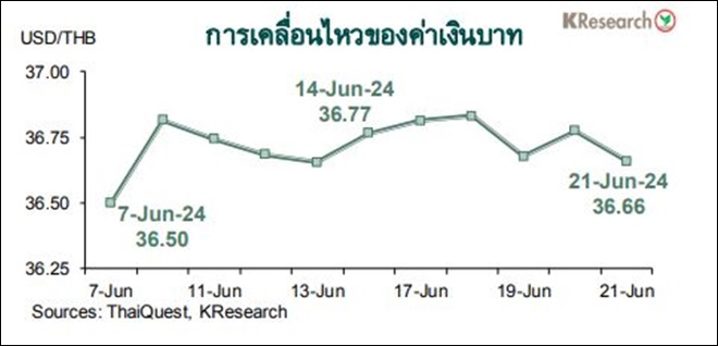 • สัปดาห์ถัดไป (24-28 มิ.ย.) ธนาคารกสิกรไทยมองกรอบการเคลื่อนไหวของค่าเงินบาทที่ระดับ 36.30-37.00 บาทต่อดอลลาร์ฯ ขณะที่ศูนย์วิจัยกสิกรไทยประเมินปัจจัยสำคัญที่ต้องติดตาม ได้แก่ รายงานเศรษฐกิจและการเงินเดือนพ.ค. ของธปท. ทิศทางเงินทุนต่างชาติ สถานการณ์สกุลเงินในภูมิภาค และถ้อยแถลงของเจ้าหน้าที่เฟด ขณะที่ตัวเลขเศรษฐกิจสหรัฐฯ ที่สำคัญ ได้แก่ ยอดขายบ้านใหม่ ยอดสั่งซื้อสินค้าคงทน ยอดทำสัญญาขายบ้านที่รอปิดการขาย และอัตราเงินเฟ้อที่คำนวณจากดัชนีราคา PCE/Core PCE เดือนพ.ค. ดัชนีความเชื่อมั่นผู้บริโภคเดือนมิ.ย. จีดีพีไตรมาส 1/2567 รวมถึงตัวเลขจำนวนผู้ขอรับสวัสดิการว่างงานรายสัปดาห์ นอกจากนี้ ตลาดยังรอติดตามข้อมูลกำไรภาคอุตสาหกรรมเดือนพ.ค. ของจีนเช่นกัน