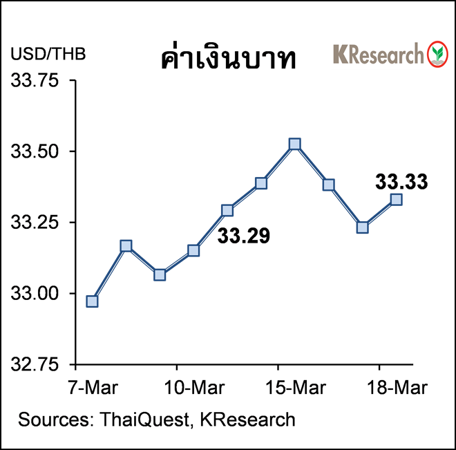 ในวันศุกร์ (18 มี.ค.) เงินบาทปิดตลาดที่ 33.33 บาทต่อดอลลาร์ฯ (หลังแตะระดับอ่อนค่าสุดในรอบ 2 เดือนที่ 33.55 ช่วงต้นสัปดาห์) เทียบกับระดับ 33.29 บาทต่อดอลลาร์ฯ ในวันศุกร์ก่อนหน้า (11 มี.ค.) ขณะที่ระหว่างวันที่ 14-18 มี.ค. นักลงทุนต่างชาติซื้อสุทธิหุ้นไทยรวม 1.11 หมื่นล้านบาท แต่มีสถานะเป็น NET OUTFLOW ในตลาดพันธบัตร 8.37 พันล้านบาท (ขายสุทธิ 6.12 พันล้านบาท และตราสารหนี้หมดอายุ 2.25 พันล้านบาท)