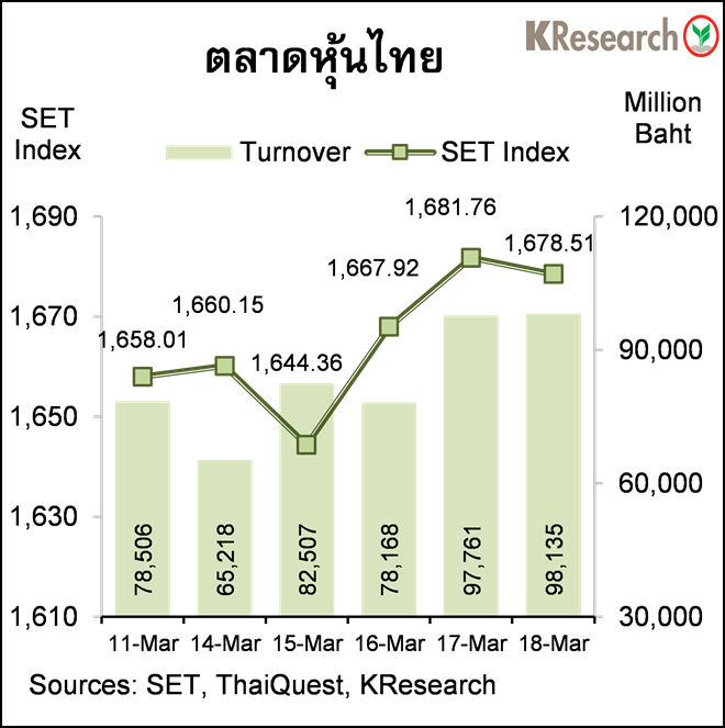 ในวันศุกร์ (18 มี.ค.) ดัชนี SET ปิดที่ระดับ 1,678.51 จุด เพิ่มขึ้น 1.24% จากสัปดาห์ก่อน ขณะที่มูลค่าการซื้อขายเฉลี่ยต่อวันอยู่ที่ 84,357.68 ล้านบาท ลดลง 26.19% จากสัปดาห์ก่อน ส่วนดัชนี mai เพิ่มขึ้น 0.46% มาปิดที่ 621.38 จุด