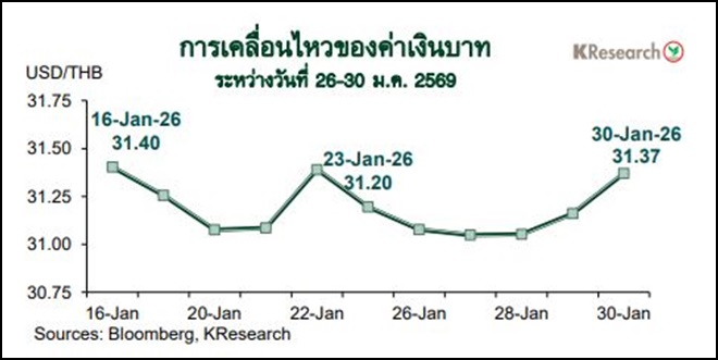 อนึ่ง กระทรวงการคลังสหรัฐฯ ได้เปิดเผยรายงานเรื่องนโยบายเศรษฐกิจมหภาคและอัตราแลกเปลี่ยนของคู่ค้าสำคัญของสหรัฐฯ เมื่อวันที่ 29 ม.ค. 2569 ซึ่งในรายงานฉบับนี้ไทยถูกเพิ่มชื่อเข้าไปอยู่ในกลุ่มติดตามใกล้ชิด (Monitoring list) ร่วมกับญี่ปุ่น จีน เยอรมนี ไอร์แลนด์ สิงคโปร์ เกาหลีใต้ สวิตเซอร์แลนด์ ไต้หวันและเวียดนาม อย่างไรก็ดี ปัจจัยนี้ยังไม่มีผลมากนักต่อการเคลื่อนไหวของเงินบาทในช่วงปลายสัปดาห์