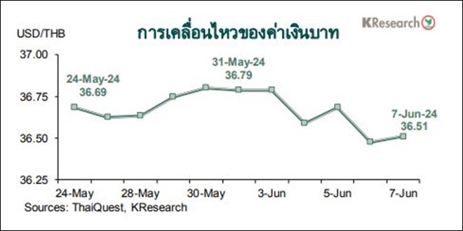 ในวันศุกร์ที่ 7 มิ.ย. 2567 เงินบาทปิดตลาดในประเทศที่ระดับ 36.51 บาทต่อดอลลาร์ฯ เทียบกับระดับ 36.79 บาทต่อดอลลาร์ฯ ในวันศุกร์ก่อนหน้า (31 พ.ค. 67) สำหรับสถานะพอร์ตการลงทุนของนักลงทุนต่างชาติระหว่างวันที่ 3-7 มิ.ย. 2567 นั้น นักลงทุนต่างชาติขายสุทธิหุ้นไทย 6,045 ล้านบาท แต่มีสถานะเป็น Net Inflows เข้าตลาดพันธบัตรไทย 2,415 ล้านบาท (ซื้อสุทธิพันธบัตรไทย 3,028 ล้านบาท หักตราสารหนี้หมดอายุ 613 ล้านบาท)
