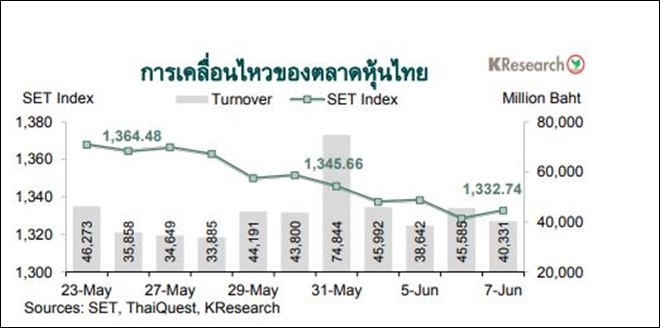 - สำหรับสัปดาห์นี้(10-14 มิ.ย.) บริษัทหลักทรัพย์กสิกรไทย จำกัด มองว่า ดัชนีหุ้นไทยมีแนวรับที่ 1,325 และ 1,310 จุด ขณะที่แนวต้านอยู่ที่ 1,345 และ 1,360 จุด ตามลำดับ โดยศูนย์วิจัยกสิกรไทยประเมินปัจจัยสำคัญที่ต้องติดตาม ได้แก่ การประชุมเฟด (11-12 มิ.ย.) การประชุมกนง. (12 มิ.ย.) และทิศทางเงินทุนต่างชาติ ส่วนข้อมูลเศรษฐกิจสหรัฐฯ ที่สำคัญ ได้แก่ ดัชนีราคาผู้บริโภคและดัชนีราคาผู้ผลิตเดือนพ.ค. รวมถึงจำนวนผู้ขอรับสวัสดิการว่างงานรายสัปดาห์ ขณะที่ปัจจัยเศรษฐกิจต่างประเทศอื่นๆ ได้แก่ การประชุม BOJ ตัวเลขจีดีพีไตรมาส 1/2567 ของญี่ปุ่น ผลผลิตภาคอุตสาหกรรมเดือนเม.ย.ของยูโรโซน ตลอดจนดัชนีราคาผู้บริโภคและดัชนีราคาผู้ผลิตเดือนพ.ค. ของจีน