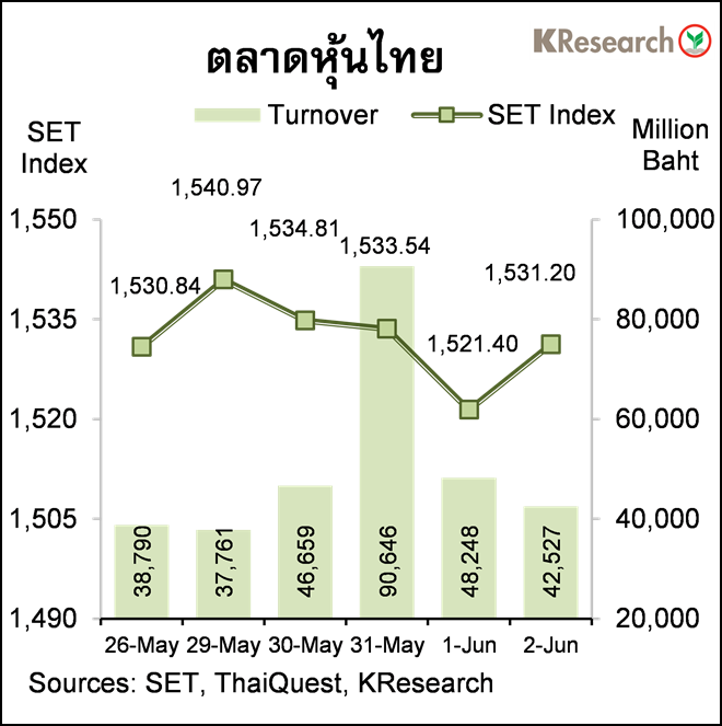 ในวันศุกร์ (2 มิ.ย.) ดัชนี SET ปิดที่ระดับ 1,531.20 จุด เพิ่มขึ้น 0.02% จากระดับปลายสัปดาห์ก่อน ขณะที่มูลค่าการซื้อขายเฉลี่ยต่อวันอยู่ที่ 53,168.16 ล้านบาท เพิ่มขึ้น 12.04% จากสัปดาห์ก่อน ส่วนดัชนี mai เพิ่มขึ้น 0.50% มาปิดที่ระดับ 486.80 จุด