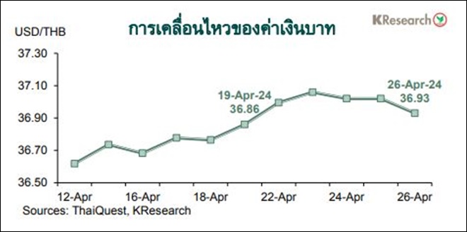 ในวันศุกร์ที่ 26 เม.ย. 2567 เงินบาทปิดตลาดในประเทศที่ระดับ 36.93 บาทต่อดอลลาร์ฯ หลังแตะระดับอ่อนค่าสุดในรอบกว่า 6 เดือนครึ่งที่ 37.17 บาทต่อดอลลาร์ฯ ในระหว่างสัปดาห์ เทียบกับระดับ 36.86 บาทต่อดอลลาร์ฯ ในวันศุกร์ก่อนหน้า (19 เม.ย. 67) สำหรับสถานะพอร์ตการลงทุนของนักลงทุนต่างชาติระหว่างวันที่ 22-26 เม.ย. 2567 นั้น นักลงทุนต่างชาติซื้อสุทธิหุ้นไทย 3,121 ล้านบาท แต่มีสถานะเป็น Net Outflows ออกจากตลาดพันธบัตรไทย 2,974 ล้านบาท (ขายสุทธิพันธบัตรไทย 993 ล้านบาท และตราสารหนี้หมดอายุ 1,981 ล้านบาท)