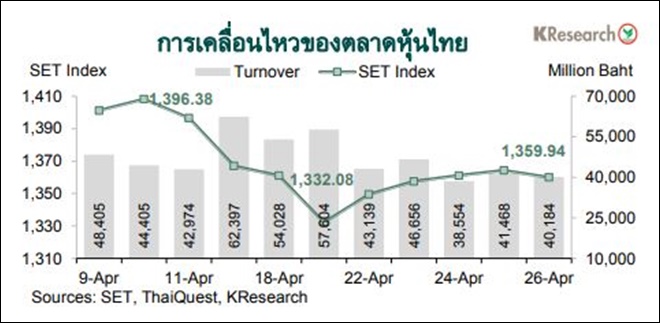 ในวันศุกร์ที่ 26 เม.ย. 2567 ดัชนี SET ปิดที่ระดับ 1,359.94 จุด เพิ่มขึ้น 2.09% จากระดับปลายสัปดาห์ก่อน ขณะที่มูลค่าการซื้อขายเฉลี่ยต่อวันอยู่ที่ 42,000.23 ล้านบาท ลดลง 27.60% จากสัปดาห์ก่อน ส่วนดัชนี mai เพิ่มขึ้น 2.27% มาปิดที่ระดับ 391.21 จุด