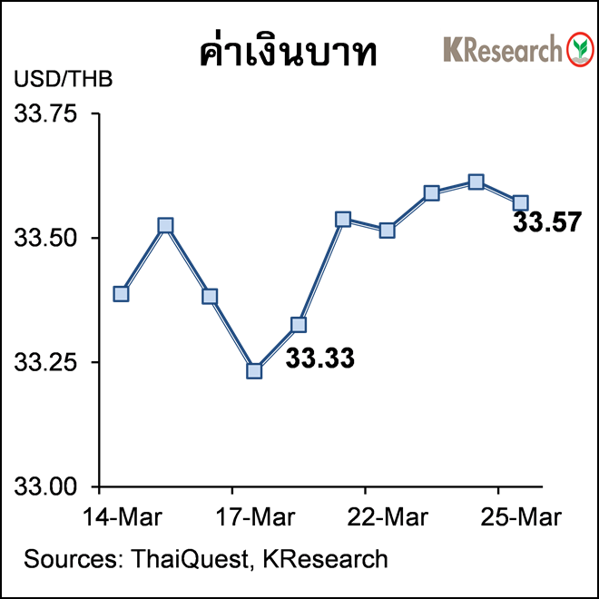 ในวันศุกร์ (25 มี.ค.) เงินบาทปิดตลาดที่ 33.57 บาทต่อดอลลาร์ฯ (หลังแตะระดับอ่อนค่าสุดในรอบกว่า 2 เดือนครั้งใหม่ที่ 33.72) เทียบกับระดับ 33.33 บาทต่อดอลลาร์ฯ ในวันศุกร์ก่อนหน้า (18 มี.ค.) ขณะที่ระหว่างวันที่ 21-25 มี.ค. นักลงทุนต่างชาติซื้อสุทธิหุ้นไทยรวม 5.02 พันล้านบาท แต่มีสถานะเป็น NET OUTFLOW ในตลาดพันธบัตร 2.50 หมื่นพันล้านบาท (ขายสุทธิ 1.24 หมื่นล้านบาท และตราสารหนี้หมดอายุ 1.26 หมื่นพันล้านบาท)