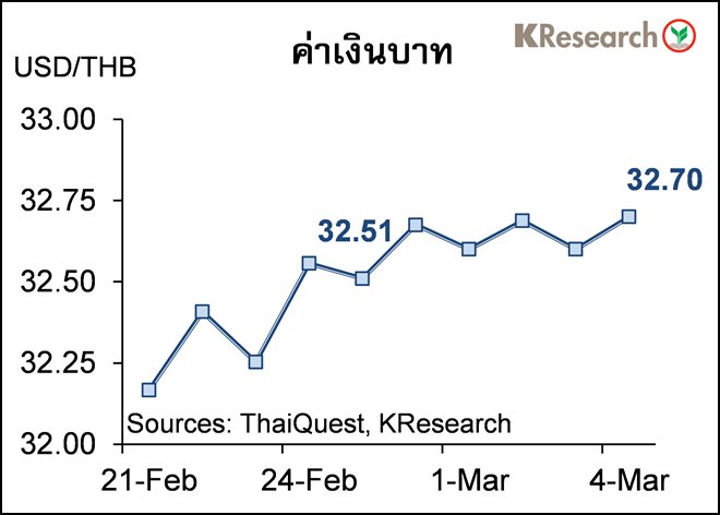 ในวันศุกร์ (4 มี.ค.) เงินบาทปิดตลาดที่ 32.70 เทียบกับระดับ 32.51 บาทต่อดอลลาร์ฯ ในวันศุกร์ก่อนหน้า (25 ก.พ.)