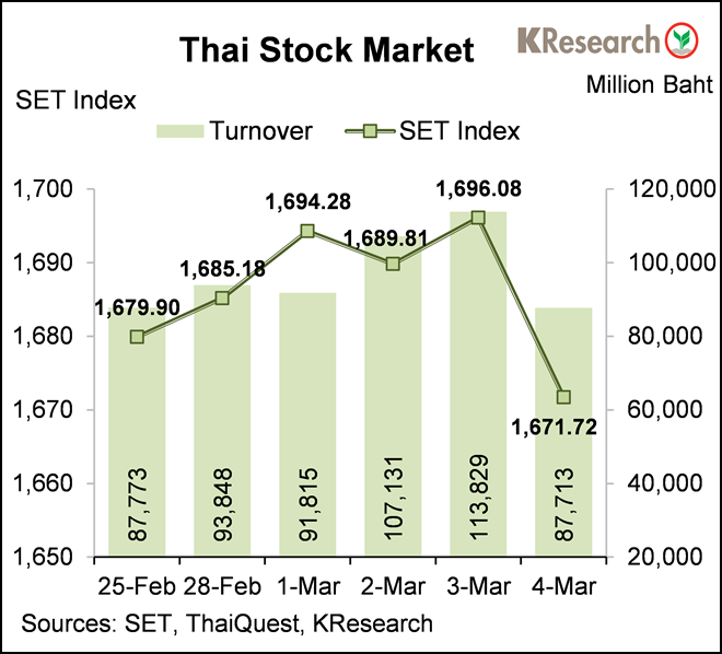 สำหรับสัปดาห์นี้(7-11 มี.ค.) บริษัทหลักทรัพย์กสิกรไทย จำกัด มองว่า ดัชนีหุ้นไทยมีแนวรับที่ 1,655 และ 1,635 จุด ขณะที่แนวต้านอยู่ที่ 1,685 และ 1,705 จุด ตามลำดับ โดยศูนย์วิจัยกสิกรไทยประเมินปัจจัยสำคัญที่ต้องติดตาม ได้แก่ สถานการณ์โควิด-19 ทิศทางเงินลงทุนของนักลงทุนต่างชาติ สถานการณ์ตึงเครียดระหว่างรัสเซียและยูเครน รวมถึงการปรับน้ำหนักดัชนี MSCI และ FTSE ส่วนข้อมูลเศรษฐกิจสหรัฐฯ ที่สำคัญ ได้แก่ ตัวเลขนำเข้าและส่งออกเดือนม.ค. ดัชนีราคาผู้บริโภคเดือนก.พ. และจำนวนผู้ขอรับสวัสดิการว่างงานรายสัปดาห์ ขณะที่ปัจจัยต่างประเทศอื่นๆ ได้แก่ การประชุม ECB (10 มี.ค.) ตัวเลขจีดีพีไตรมาส 4/64 ของยูโรโซนและญี่ปุ่น ข้อมูลเศรษฐกิจเดือนก.พ. ของจีน อาทิ ดัชนีราคาผู้ผลิต ดัชนีราคาผู้บริโภค