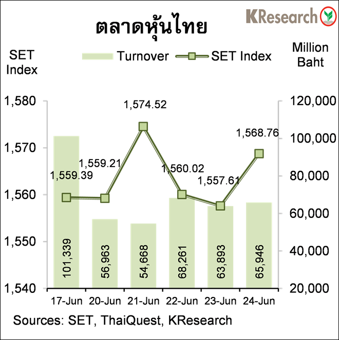 ในวันศุกร์ (24 มิ.ย.) ดัชนี SET ปิดที่ระดับ 1,568.76 จุด เพิ่มขึ้น 0.60% จากสัปดาห์ก่อน ขณะที่มูลค่าการซื้อขายเฉลี่ยต่อวันอยู่ที่ 61,946.17 ล้านบาท ลดลง 23.45% จากสัปดาห์ก่อน ส่วนดัชนี mai เพิ่มขึ้น 0.65% มาปิดที่ 606.52 จุด