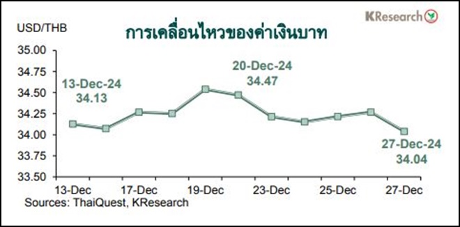 สัปดาห์ระหว่างวันที่ 30 ธ.ค. 2567 – 3 ม.ค. 2568 ธนาคารกสิกรไทยมองกรอบการเคลื่อนไหวของค่าเงินบาทที่ระดับ 33.90-34.30 บาทต่อดอลลาร์ฯ ขณะที่ศูนย์วิจัยกสิกรไทยประเมินปัจจัยสำคัญที่ต้องติดตาม ได้แก่ สัญญาณเงินทุนต่างชาติ ทิศทางเงินหยวนและราคาทองคำในตลาดโลก รวมถึงสัญญาณเกี่ยวกับนโยบายเศรษฐกิจและการค้าระหว่างประเทศของนายโดนัลด์ ทรัมป์ ขณะที่ตัวเลขเศรษฐกิจสหรัฐฯ ที่สำคัญ ได้แก่ ยอดทำสัญญาขายบ้านที่รอปิดการขายเดือนพ.ย. ดัชนี PMI/ISM ภาคการผลิตเดือนธ.ค. และจำนวนผู้ขอรับสวัสดิการว่างงานรายสัปดาห์ นอกจากนี้ตลาดยังรอติดตามดัชนี PMI ภาคการผลิตเดือนธ.ค. ของญี่ปุ่น จีน ยูโรโซน และอังกฤษด้วยเช่นกัน