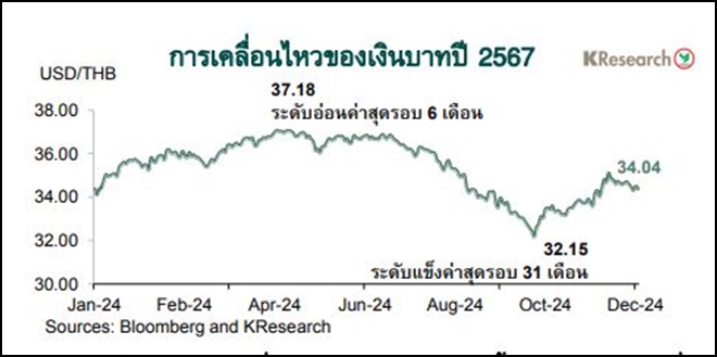 เงินบาทพลิกกลับมาแข็งค่าขึ้นในช่วงไตรมาสที่ 3/2567 โดยมีปัจจัยหนุนจากตัวเลขจีดีพีไตรมาส 2/2567 ของไทยที่ออกมาดีกว่าตัวเลขคาดการณ์ของนักวิเคราะห์ และการกลับมาแข็งค่าขึ้นของเงินเยน หลัง BOJ เริ่มคุมเข้มนโยบายการเงินด้วยการปรับขึ้นอัตราดอกเบี้ย ขณะที่ เงินดอลลาร์ฯ กลับมาเผชิญแรงเทขาย โดยเฉพาะอย่างยิ่งในช่วงหลังจากเฟดปรับลดอัตราดอกเบี้ยนโยบายลงถึง 50 basis points ในการประชุม FOMC เดือนก.ย. 2567 โดยเงินบาทแตะระดับแข็งค่าสุดในรอบ 31 เดือนที่ 32.15 บาทต่อดอลลาร์ฯ ในช่วงปลายเดือนก.ย. 2567 อย่างไรก็ดี เงินบาทกลับมาอ่อนค่าลงอีกครั้งในช่วงไตรมาสสุดท้ายของปี 2567 สอดคล้องกับสัญญาณฟื้นตัวล่าช้าของเศรษฐกิจไทยและการปรับลดอัตราดอกเบี้ยนโยบายของกนง. ในเดือนต.ค. 2567 ขณะที่ เงินดอลลาร์ฯ เริ่มฟื้นตัวกลับมาอีกครั้ง หลังนายโดนัลด์ ทรัมป์ชนะการเลือกตั้งประธานาธิบดีสหรัฐฯ ซึ่งจุดชนวนความกังวลต่อประเด็นความขัดแย้งของนโยบายการค้า (ทำให้เงินหยวน สกุลเงินเอเชียและเงินบาทอ่อนค่าลง) ประกอบกับเฟดมีการปรับมุมมองที่มีต่อทิศทางเศรษฐกิจและเงินเฟ้อสหรัฐฯ ในปี 2568 ซึ่งสะท้อนว่า แม้เฟดอาจจะยังปรับลดอัตราดอกเบี้ยนโยบายอย่างต่อเนื่อง แต่จังหวะและจำนวนรอบของการปรับลดดอกเบี้ยอาจชะลอลงและมีความไม่แน่นอนมากขึ้น