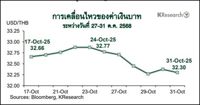 ในวันศุกร์ที่ 31 ต.ค. 2568 เงินบาทปิดตลาดในประเทศที่ 32.30 บาทต่อดอลลาร์ฯ เทียบกับระดับ 32.77 บาทต่อดอลลาร์ฯ ในวันศุกร์ก่อนหน้า (24 ต.ค.) สำหรับสถานะพอร์ตการลงทุนของนักลงทุนต่างชาติระหว่างวันที่ 27-31 ต.ค. 2568 นั้น นักลงทุนต่างชาติขายสุทธิหุ้นไทย 5,045 ล้านบาท และมีสถานะอยู่ในฝั่ง Net Inflows เข้าตลาดพันธบัตรไทย 30,483 ล้านบาท (ซื้อสุทธิพันธบัตร 30,498 ล้านบาท หักตราสารหนี้หมดอายุ 15 ล้านบาท)