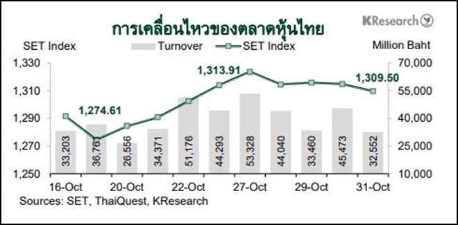 สำหรับสัปดาห์นี้(3-7 พ.ย. 68) บริษัทหลักทรัพย์กสิกรไทย จำกัด มองว่า ดัชนีหุ้นไทยมีแนวรับที่ 1,300 และ 1,285 จุด ขณะที่แนวต้านอยู่ที่ 1,330 และ 1,345 จุด ตามลำดับ โดยศูนย์วิจัยกสิกรไทยประเมินปัจจัยสำคัญที่ต้องติดตาม ได้แก่ ถ้อยแถลงของเจ้าหน้าที่เฟด ตัวเลขเงินเฟ้อเดือนต.ค. ของไทย ผลประกอบการไตรมาส 3/2568 ของบจ.ไทย สถานการณ์ชัตดาวน์ในสหรัฐฯ และทิศทางเงินทุนต่างชาติ ขณะที่ปัจจัยเศรษฐกิจต่างประเทศอื่น ๆ ได้แก่ ข้อมูลการจ้างงานภาคเอกชนของ ADP เดือนต.ค. ของสหรัฐฯ ดัชนี PMI ภาคการผลิตและการบริการเดือนต.ค. ของสหรัฐฯ ยูโรโซน จีน และญี่ปุ่น ยอดค้าปลีกและดัชนีราคาผู้ผลิตเดือนก.ย. ของ ยูโรโซน ตลอดจนตัวเลขการส่งออกเดือนต.ค. ของจีน