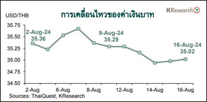 เงินบาทแข็งค่าผ่านแนว 35.00 ไปแตะระดับแข็งค่าสุดในรอบ 7 เดือนที่ 34.84 บาทต่อดอลลาร์ฯ ในช่วงต้นสัปดาห์ท่ามกลางแรงกดดันต่อค่าเงินดอลลาร์ฯ จากกระแสการคาดการณ์เกี่ยวกับความเป็นไปได้ที่เฟดอาจปรับลดอัตราดอกเบี้ยนโยบายมากกว่า 25 basis points ในการประชุม FOMC เดือนก.ย. หลังตัวเลขดัชนีราคาผู้ผลิตของสหรัฐฯ ออกมาต่ำกว่าตัวเลขคาดการณ์ของนักวิเคราะห์ นอกจากนี้การปรับตัวขึ้นของราคาทองคำในตลาดโลกก็เพิ่มแรงหนุนให้เงินบาทแข็งค่าด้วยเช่นกัน