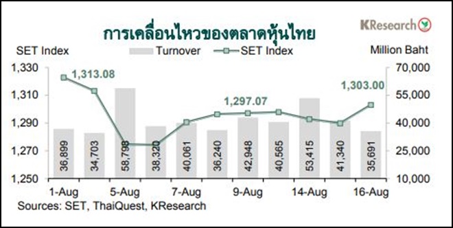 สัปดาห์นี้(19-23 ส.ค.) บริษัทหลักทรัพย์กสิกรไทย จำกัด มองว่า ดัชนีหุ้นไทยมีแนวรับที่ 1,290 และ 1,280 จุด ขณะที่แนวต้านอยู่ที่ 1,310 และ 1,330 จุด ตามลำดับ โดยศูนย์วิจัยกสิกรไทยประเมินปัจจัยสำคัญที่ต้องติดตาม ได้แก่ ตัวเลขจีดีพีไตรมาส 2/2567 ของไทย การประชุมกนง. สุนทรพจน์ของประธานเฟดในการประชุมประจำปีของเฟดที่เมืองแจ็กสัน โฮล รวมถึงถ้อยแถลงของเจ้าหน้าที่เฟด ประเด็นการเมืองในประเทศ และทิศทางเงินทุนต่างชาติ ส่วนข้อมูลเศรษฐกิจสหรัฐฯ ที่สำคัญ ได้แก่ บันทึกการประชุมเฟด ดัชนี PMI เดือนส.ค. ยอดขายบ้านมือสองและยอดขายบ้านใหม่เดือนก.ค. รวมถึงจำนวนผู้ขอรับสวัสดิการว่างงานรายสัปดาห์ ขณะที่ปัจจัยเศรษฐกิจต่างประเทศอื่นๆ ได้แก่ การกำหนดอัตราดอกเบี้ย LPR เดือนส.ค. ของจีน ดัชนีราคาผู้บริโภคเดือนก.ค. ของยูโรโซนและญี่ปุ่น ตลอดจนดัชนี PMI เดือนส.ค.ของญี่ปุ่น ยูโรโซน และอังกฤษ