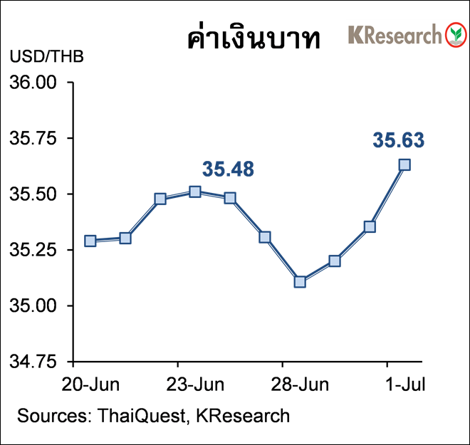 สัปดาห์นี้(4-8 ก.ค.) ธนาคารกสิกรไทยมองกรอบการเคลื่อนไหวของเงินบาทที่ระดับ 35.00-36.00 บาทต่อดอลลาร์ฯ ขณะที่ศูนย์วิจัยกสิกรไทยประเมินปัจจัยสำคัญที่ต้องติดตาม ได้แก่ สถานการณ์เงินทุนต่างชาติ และตัวเลขเงินเฟ้อเดือนมิ.ย. ของไทย ขณะที่ตัวเลขเศรษฐกิจสหรัฐฯ ที่สำคัญ ได้แก่ ตัวเลขการจ้างงานนอกภาคเกษตร อัตราการว่างงาน ข้อมูลการจ้างงานภาคเอกชนโดย ADP และดัชนี PMI/ISM ภาคบริการเดือนมิ.ย. ยอดสั่งซื้อภาคโรงงานเดือนพ.ค. จำนวนผู้ขอรับสวัสดิการว่างงานรายสัปดาห์ และรายงานการประชุมเฟดเมื่อวันที่ 14-15 มิ.ย. นอกจากนี้ตลาดยังรอติดตามผลการประชุมนโยบายการเงินของธนาคารกลางออสเตรเลีย รวมถึงดัชนี PMI ภาคบริการเดือนมิ.ย. ของจีน ยุโรป และอังกฤษ และดัชนีราคาผู้ผลิตเดือนพ.ค.ของยุโรปด้วยเช่นกัน