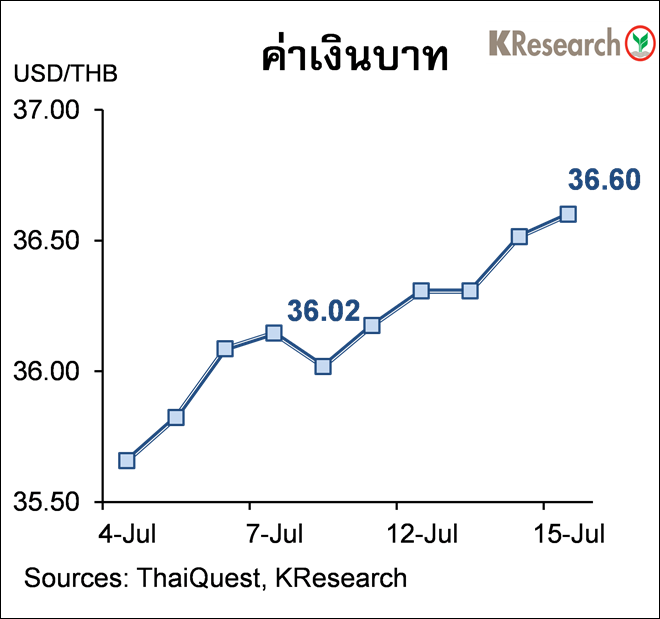 ในวันศุกร์ที่ 15 ก.ค. 2565 เงินบาทแตะระดับอ่อนค่าสุดในรอบ 15 ปี 8 เดือนที่ 36.73 ก่อนจะปิดตลาดที่ระดับ 36.60 เทียบกับระดับ 36.02 บาทต่อดอลลาร์ฯ ในวันศุกร์ก่อนหน้า (8 ก.ค.) ขณะที่ระหว่างวันที่ 11-15 ก.ค. นักลงทุนต่างชาติขายสุทธิหุ้นไทย 1,141 ล้านบาท ขณะที่มีสถานะเป็น NET OUTFLOW ออกจากตลาดพันธบัตร 2,079 ล้านบาท (ขายสุทธิพันธบัตรไทย 2,063 ล้านบาท และมีตราสารหนี้ที่หมดอายุ 16 ล้านบาท)