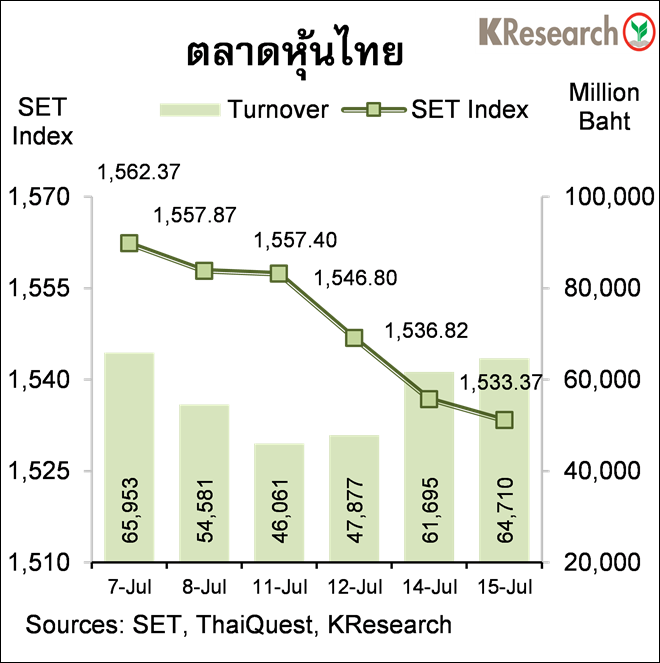 ในวันศุกร์ (15 ก.ค.) ดัชนี SET ปิดที่ระดับ 1,533.37 จุด ลดลง 1.57% จากสัปดาห์ก่อน ขณะที่มูลค่าการซื้อขายเฉลี่ยต่อวันอยู่ที่ 55,086.14 ล้านบาท ลดลง 15.27% จากสัปดาห์ก่อน ส่วนดัชนี mai ลดลง 1.32% มาปิดที่ 564.78 จุด