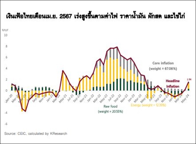 เงินเฟ้อทั่วไปของไทยเดือนพ.ค. 2567 บวก 1.54% YoY ต่อเนื่องเป็นเดือนที่ 2 และสูงสุดในรอบ 13 เดือน โดยเป็นผลมาจาก