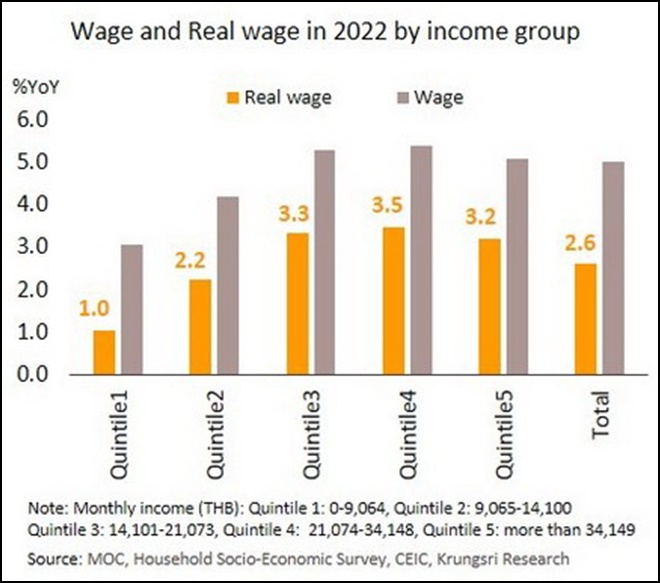 วิจัยกรุงศรีคงคาดการณ์ว่ากนง.จะตรึงดอกเบี้ยไว้ที่ระดับ 0.50% ตลอดจนถึงสิ้นปีนี้ เนื่องจาก (i) แม้อัตราเงินเฟ้อมีความเสี่ยงด้านสูงเพิ่มขึ้น แต่กนง.คาดว่าอัตราเงินเฟ้อเฉลี่ยในปี 2565 และอัตราเงินเฟ้อคาดการณ์ในระยะปานกลางยังอยู่ในกรอบเป้าหมาย (ต่ำกว่า 3%) และยังไม่เห็นสัญญาณการปรับเพิ่มของราคาสินค้าและบริการเป็นวงกว้าง อีกทั้งแรงกดดันเงินเฟ้อ ด้านอุปสงค์ยังอยู่ในระดับต่ำ (ii) การฟื้นตัวของเศรษฐกิจยังมีความเปราะบางและแตกต่างกันอยู่มาก โดยเฉพาะภาคท่องเที่ยวที่ฟื้นตัวล่าช้าและต่ำกว่าช่วงก่อนเกิดโควิด-19 อยู่มาก ขณะที่กนง.ประเมินเศรษฐกิจโดยรวมกว่าจะฟื้นกลับสู่ระดับก่อนวิกฤตการระบาดอาจเป็นช่วงปลายปีนี้หรือต้นปีหน้า และ (iii) ตลาดแรงงานยังอ่อนแอและค่าจ้างที่อาจยังอยู่ในระดับต่ำกว่าช่วงเกิดวิกฤตการระบาด โดยวิจัยกรุงศรีประเมินค่าจ้างที่แท้จริงของครัวเรือนที่มีรายได้ต่ำสุดในปีนี้จะเพิ่มขึ้นเพียง 1% เมื่อเทียบรายปี ต่ำกว่าค่าจ้างที่แท้จริงของครัวเรือนรายได้สูงสุดที่จะเพิ่มขึ้น 3.2% ขณะที่ค่าจ้างที่แท้จริงของทุกกลุ่มครัวเรือนในปีนี้จะยังอยู่ต่ำกว่าระดับก่อนเกิดโควิด-19 สะท้อนถึงกำลังซื้อที่ยังอ่อนแอและมีความแตกต่างกันตามกลุ่มรายได้ ซึ่งจะส่งผลให้ความสามารถในการใช้จ่ายไม่เท่าเทียมกันและยังบ่งชี้ถึงความเปราะบางในการฟื้นตัวของเศรษฐกิจ