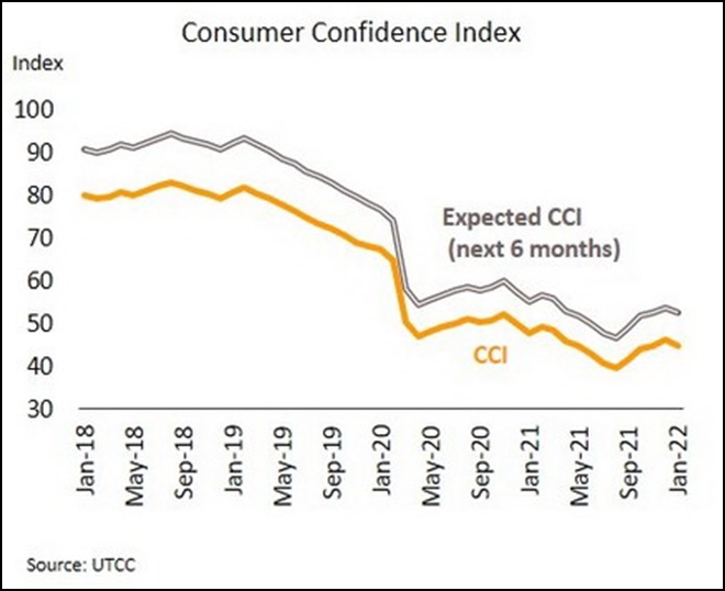 ความเชื่อมั่นผู้บริโภคเดือนมกราคมปรับลดลงเป็นครั้งแรกในรอบ 5 เดือน สะท้อนความอ่อนแอของการใช้จ่ายในประเทศ แต่ยังพอมีแรงพยุงจากมาตรการรัฐ โดยดัชนีความเชื่อมั่นผู้บริโภคเดือนมกราคมปรับลดลงสู่ระดับต่ำสุดในรอบ 3 เดือนที่ 44.8 จาก 46.2 เดือนธันวาคม เช่นเดียวกับดัชนีความเชื่อมั่นฯ คาดการณ์ (6 เดือนข้างหน้า) ปรับลดลงสู่ระดับ 52.5 จาก 53.8 เดือนธันวาคม ปัจจัยลบจากความกังวลการระบาดของไวรัสโอมิครอนที่แพร่ได้เร็ว ราคาน้ำมันเชื้อเพลิงที่ปรับสูงขึ้นกระทบต่อราคาวัตถุดิบและราคาสินค้า รวมถึงความกังวลเกี่ยวกับเสถียรภาพทางการเมืองในประเทศ