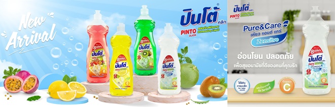 ล่าสุด น้ำยาล้างจานปินโต้ได้ออกผลิตภัณฑ์ใหม่ ภายใต้ชื่อ “ปินโต้คลิก” บรรจุในขวดเพชร สูตรใหม่ 8 in1 หรือ 8 Actions ที่สามารถขจัดกลิ่นคาว ขจัดคราบมัน ขจัดคราบอาหาร ไม่มีสารตกค้าง ใช้ล้างภาชนะพลาสติกได้ ไร้กลิ่นติดจาน ผสมน้ำมะนาวแท้ที่ให้วิตามินซี และได้กลิ่นหอมมะนาวระหว่างใช้งาน มีทั้งหมด 4 กลิ่นให้เลือกใช้ ได้แก่ กลิ่นมะนาว กลิ่นกีวี่ กลิ่นส้มโอและเสาวรส และสูตรอ่อนละมุน Pure & Care สูตรพรีเมียมที่อ่อนโยน ปลอดภัย ไร้สารเคมี สามารถใช้ทำความสะอาดภาชนะของเด็กได้อย่างไม่ต้องกังวลถึงสารตกค้าง และส่วนผสมผสมเข้มข้น ช่วยให้ขจัดคราบสกปรก คราบมัน กลิ่นคาวอาหาร ได้ในคลิกเดียว