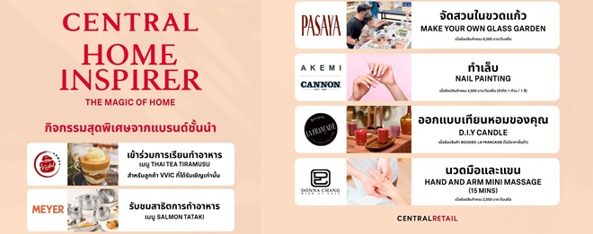 พร้อมพบกับกิจกรรมสุดครีเอทจากทางห้างและแบรนด์ชั้นนำที่จะเติมเต็มประสบการณ์การใช้ชีวิตให้มีความสุขใน มุมโปรดของ “บ้าน” ที่แผนกบ้าน ห้างเซ็นทรัลชิดลม และห้างเซ็นทรัลสาขาที่ร่วมรายการ อาทิ..