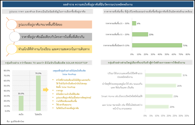 แม้การเลือกใช้พลังงานหมุนเวียนอย่างการติดตั้งโซลาร์รูฟท็อปเพื่อรับมือกับค่าไฟฟ้าที่เพิ่มขึ้น น่าจะเป็นอีกทางเลือกหนึ่งในการช่วยประหยัดค่าใช้จ่ายระยะยาว แต่กลุ่มตัวอย่าง 70% มองว่า ยังไม่จำเป็นต้องติดตั้ง เนื่องจากการลงทุนติดตั้งยังมีราคาสูงหากเทียบกับค่าไฟฟ้าที่ต้องจ่ายต่อเดือนที่แม้เพิ่มขึ้นแต่ยังพอรับได้ ขณะที่กลุ่มตัวอย่างบางส่วน มองว่า ยังไม่มีความจำเป็น เนื่องจากที่อยู่อาศัยไม่เอื้อต่อการติดตั้งอุปกรณ์ อย่างไรก็ดี กลุ่มตัวอย่างที่มีความสนใจติดตั้ง (30%) ส่วนใหญ่เป็นกลุ่มที่มีค่าไฟฟ้าที่ต้องจ่ายต่อเดือนสูง นอกจากนี้ กลุ่มตัวอย่างบางส่วนเลือกปรับตัวด้วยการหันมาใช้หลอดประหยัดไฟ/เครื่องใช้ไฟฟ้าประหยัดพลังงาน การติดฟิล์มกันแสงเพื่อลดอุณหภูมิความร้อนในบ้าน การติดตั้งระบบเปิด-ปิดไฟอัตโนมัติและโคมไฟโซลาร์เซลล์ หรือแผงโซลาร์ ขนาดเล็กสำหรับไฟส่องสว่างทางเดินหรือในพื้นที่สวน