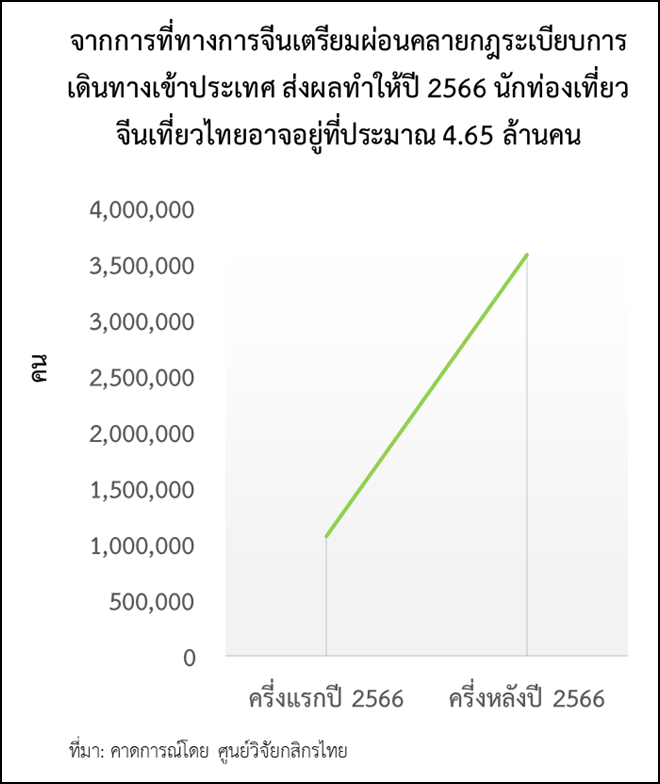 • ศูนย์วิจัยกสิกรไทย จึงมองว่า ในช่วงครึ่งหลังของปี 2566 เมื่อเส้นทางการบินกลับมาขยายตัว ควบคู่กับการทำการตลาดของหน่วยงานท่องเที่ยวและผู้ประกอบการมีมากขึ้น โดยเฉพาะถ้าไทยถูกเลือกเป็นหนึ่งในประเทศนำร่องของการฟื้นฟูการเดินทางแบบกลุ่มขนาดใหญ่ คงจะทำให้ชาวจีนเดินทางท่องเที่ยวในไทยเร่งตัวขึ้นก้าวกระโดดจากช่วงครึ่งปีแรก เนื่องจากจะมีฤดูกาลท่องเที่ยวของชาวจีนที่สำคัญ คือ ช่วงปิดภาคเรียนฤดูร้อน (ระหว่างเดือนก.ค.-ส.ค. ของทุกปี) และช่วงวันหยุดยาววันชาติจีน (ในช่วงวันที่ 1-7 ต.ค. ของทุกปี)
