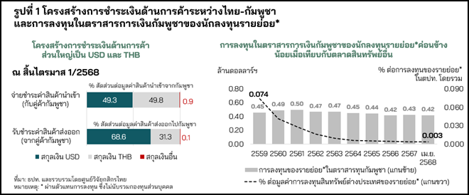 ข้อมูล ณ ไตรมาสที่ 1/2568 สัดส่วนธุรกรรมการรับชำระค่าสินค้าส่งออกของไทย (จากคู่ค้าในกัมพูชา) อยู่ในรูปสกุลเงินดอลลาร์สหรัฐฯ และเงินบาท ประมาณ 68.6% และ 31.3% ของมูลค่าสินค้าส่งออกไทยไปกัมพูชา ตามลำดับ ขณะที่ สัดส่วนธุรกรรมการชำระค่าสินค้านำเข้าของไทย (กับคู่ค้าในกัมพูชา) อยู่ในรูปสกุลเงินดอลลาร์สหรัฐฯ และเงินบาท 49.3% และ 49.8% ของมูลค่าสินค้าเข้าจากกัมพูชา (รูปที่ 1)