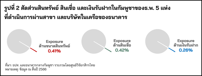 อย่างไรก็ดี หากมองในมิติของ Exposure ในกัมพูชาของธนาคารพาณิชย์ 5 แห่ง พบว่า ยังมีสัดส่วนค่อนข้างน้อยเมื่อเทียบกับการดำเนินงานในประเทศไทย โดยขนาดสินทรัพย์ สินเชื่อ และเงินฝากในกัมพูชา มีสัดส่วนประมาณ 0.41%, 0.42% และ 0.26% เมื่อเทียบกับยอดคงค้างทั้งระบบธนาคารพาณิชย์ในไทยตามลำดับ (รูปที่ 2)
