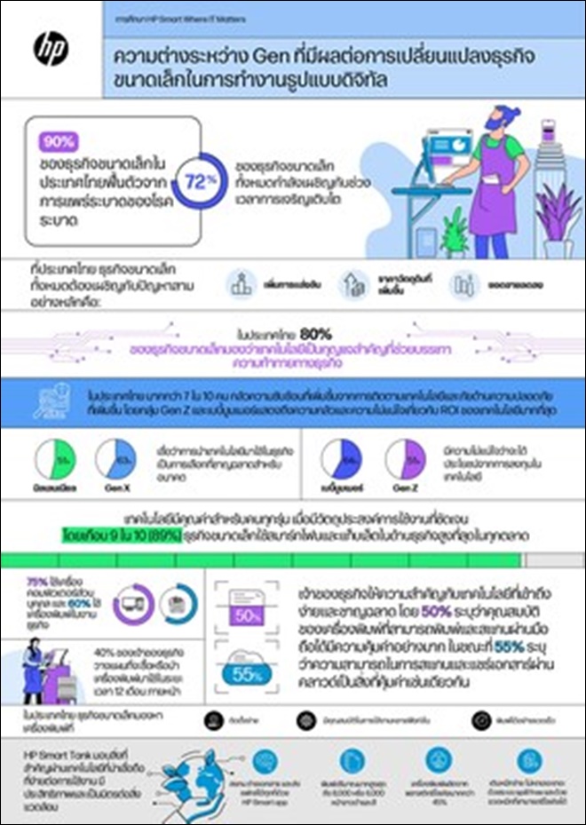 ในประเทศไทย ธุรกิจขนาดเล็กต่างมองหาเครื่องพิมพ์ที่มีราคาไม่แพง (44%) มีการใช้งานมัลติฟังก์ชั่น (37%) และมีค่าบำรุงรักษาต่ำ (37%) ผลสำรวจพบว่า 57% ของธุรกิจไทยซื้อเครื่องพิมพ์อัจฉริยะเพื่อที่จะได้ใช้ประโยชน์จากเทคโนโลยีใหม่ล่าสุด พวกเขากำลังมองหาเครื่องพิมพ์อัจฉริยะที่ช่วยให้สามารถสั่งพิมพ์ผ่านมือถือและได้รับประสิทธิภาพที่เพิ่มขึ้น HP Smart Tank เป็นตัวอย่างของเทคโนโลยีที่มีความเรียบง่ายและไม่ยุ่งยากซึ่งช่วยให้ธุรกิจเอาชนะความสงสัยและความกลัวที่ไม่แน่นอนที่มีอยู่ได้