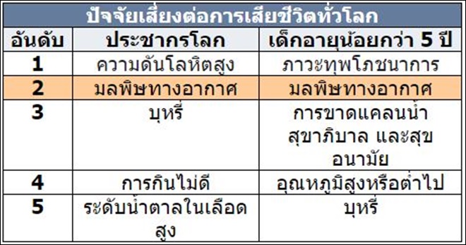 รายงานฉบับนี้นำเสนอรายละเอียดผลกระทบทางสุขภาพจากมลพิษทางอากาศ ซึ่งกลายเป็นปัจจัยเสี่ยงต่อการเสียชีวิตของประชากรโลกแซงหน้าการสูบบุหรี่และการกินไม่ดี