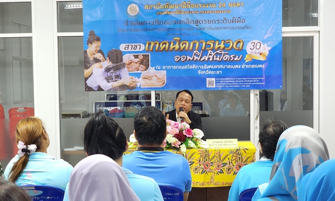 สถาบันพัฒนาฝีมือแรงงาน 24 ยะลา ร่วมกับกองสวัสดิการสังคมเทศบาลเมืองเบตงเปิดหลักสูตรการฝึกยกระดับฝีมือ สาขาเทคนิคการนวดออฟฟิศซินโดรม ระหว่างวันที่ 19 – 23 มกราคม 2567 ให้กับประชาชน กลุ่มสตรี และกลุ่มแรงงานภาคท่องเที่ยวในพื้นที่อำเภอเบตง