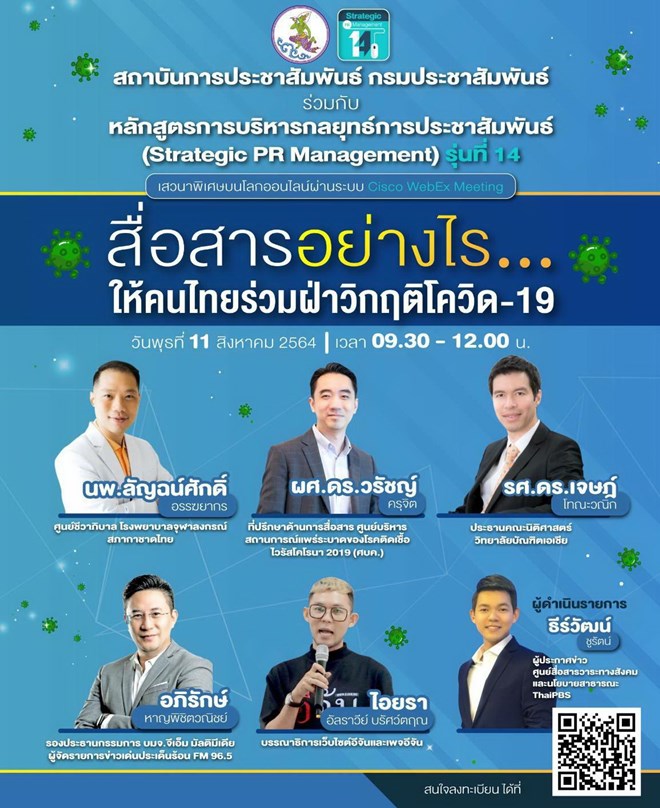 สถาบันการประชาสัมพันธ์ กรมประชาสัมพันธ์ ร่วมกับ หลักสูตรการบริหารกลยุทธ์การประชาสัมพันธ์(Strategic PR Management) รุ่นที่ 14 เปิดหลักสูตรสำคัญในช่วงการแพร่ระบาดของโควิด-19 ที่สร้างความสับสนให้กับประชาชนชาวไทยไม่น้อย ในหัวข้อ "สื่อสารอย่างไร ให้คนไทยร่วมฝ่าวิกฤติโควิด-19"ซึ่งท่านผู้ไดสนใจสามารถสมัครได้ตามคิวอาร์โค้ดด้านล่างนี้