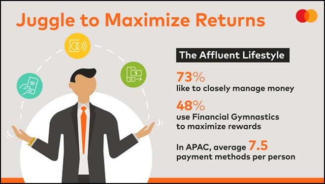 มาสเตอร์การ์ดเปิดเผยว่า 73% ของผู้บริโภคกลุ่มที่มีกำลังซื้อสูงมักนิยมบริหารจัดการเงินของตนเองอย่างชาญฉลาด โดย 48% ใช้เทคนิค Financial Gymnastics หรือการใช้กลยุทธ์การเงินขั้นสูงเพื่อให้ได้ผลลัพธ์สูงสุด ผู้บริโภคเหล่านี้จัดอยู่ในกลุ่ม 10% ของครัวเรือนที่มีรายได้สูงสุดของประเทศ มีเทคนิคการจัดการวิธีการชำระเงินที่หลากหลาย วางแผนการใช้จ่ายอย่างรอบคอบ และอาศัยข้อมูลจากแหล่งต่าง ๆ เช่น การค้นคว้าด้วยตัวเองหรือการบอกต่อแบบปากต่อปาก