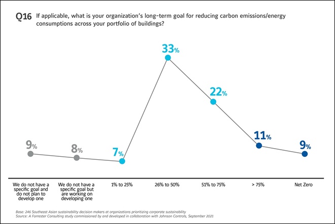 "ผลสำรวจแสดงให้เห็นอย่างชัดเจนว่า ผู้นำธุรกิจในเอเชียตะวันออกเฉียงใต้มองว่าความยั่งยืนมีความสำคัญเป็นอันดับหนึ่งสำหรับธุรกิจในตอนนี้ ในบรรดาโครงการความยั่งยืนหลากหลายรูปแบบนั้น สถานที่ทำงานและอาคารประหยัดพลังงานถูกมองว่ามีความสำคัญมากที่สุด โดยผู้ตอบแบบสำรวจ 91% ให้ความสำคัญกับการลงทุนในส่วนนี้ในช่วงสามปีข้างหน้า" คุณชาร์ลส์ ลิม (Charles Lim) หัวหน้าประจำภูมิภาคเอเชียตะวันออกเฉียงใต้ บริษัท จอห์นสัน คอนโทรลส์ กล่าว "ผู้ตอบแบบสำรวจมากกว่า 3 ใน 4 ตั้งเป้าลดการปล่อยคาร์บอนทั่วอาคารลง 26% หรือมากกว่านั้น และผู้ตอบแบบสำรวจ 11% ตั้งเป้าหมายปล่อยคาร์บอนสุทธิเป็นศูนย์หรือปล่อยคาร์บอนเป็นลบ"