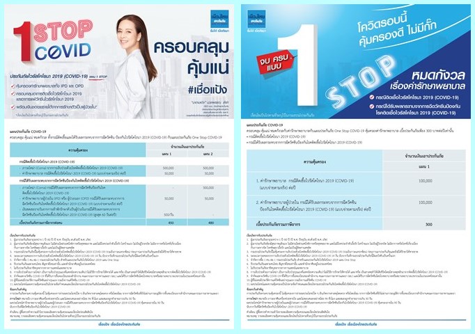 แผน 2 : เบี้ยประกันภัย 450 บาท/ปี ให้ความคุ้มครองกรณีโรคติดเชื้อไวรัสโคโรนา 2019 (Covid-19) โดยให้วงเงินความคุ้มครองกับค่ารักษาพยาบาลสูงสุด 50,000 บาท (จ่ายตามจริง) ภาวะโคม่าสูงสุดถึง 500,000 บาท และกรณีได้รับผลกระทบจากการฉีดวัคซีนป้องกันโรคติดเชื้อไวรัสโคโรนา 2019 (Covid-19) ให้วงเงินสำหรับค่ารักษาพยาบาล IPD และ OPD สูงถึง 50,000 บาท และรับเงินชดเชยรายวันจากการเข้าพักรักษาตัวขณะเป็นผู้ป่วยในวันละ 500 บาท