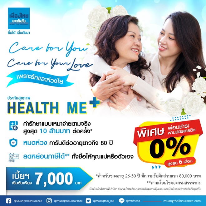 เมืองไทยประกันภัย ชวนคุณ Care for you, Care for your love #เพราะรักและห่วงใย บอกรักแม่ ด้วยประกันสุขภาพ Health Me+ (เฮลท์มี พลัส) ที่ยกระดับความคุ้มครอง ให้ตอบโจทย์ทุกคน ทุกความต้องการ อัพเกรดความคุ้มครองแบบเหมา ๆ ได้ตามใจ ทั้งค่ารักษาพยาบาลผู้ป่วยในเหมาจ่ายต่อครั้งสูงสุดถึง 10 ล้านบาท อัพค่าห้องพักรักษาตัวได้สูงสุด 15,000 บาท/วัน เสริมความคุ้มครองได้ตามต้องการ ไม่ปฏิเสธการต่ออายุ คุ้มครองถึงอายุ 80 ปี ไม่ต้องสำรองจ่าย สำหรับโรงพยาบาลในเครือทั่วประเทศ และลดหย่อนภาษีได้สูงสุดถึง 25,000 บาท พิเศษสิทธิผ่อนชำระผ่านบัตรเครดิต 0% สูงสุด 6 เดือน ให้คุณพร้อมดูแลและบอกรักแม่ได้ในทุกวัน