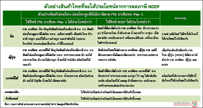 •             อานิสงส์ทางอ้อม: การรวมตัวเป็น RCEP ในอีกด้านหนึ่งทำให้ประเทศ Plus 5 ที่ไม่เคยมี FTA ต่อกัน ได้แก่ จีน ญี่ปุ่น เกาหลีใต้ และนิวซีแลนด์ ได้มี FTA ร่วมกันเป็นครั้งแรก ส่งผลให้สินค้าขั้นกลางของไทยที่ทำตลาดได้ดีอยู่แล้วมีโอกาสขยายตัว อาทิ ยานยนต์และชิ้นส่วน เม็ดพลาสติกและผลิตภัณฑ์พลาสติก เคมีภัณฑ์ ยางพาราและผลิตภัณฑ์ยาง ชิ้นส่วนเครื่องใช้ไฟฟ้าและอิเล็กทรอนิกส์ อย่างไรก็ดี การที่ Plus 5 มีแนวโน้มค้าขายกันเองจากการลดกำแพงภาษีระหว่างกันครั้งนี้คงไม่ส่งผลให้เกิดการแย่งชิงตลาดกับสินค้าอาเซียนและสินค้าไทยที่ทำตลาดอยู่เพราะเป็นสินค้าคนละประเภทกัน