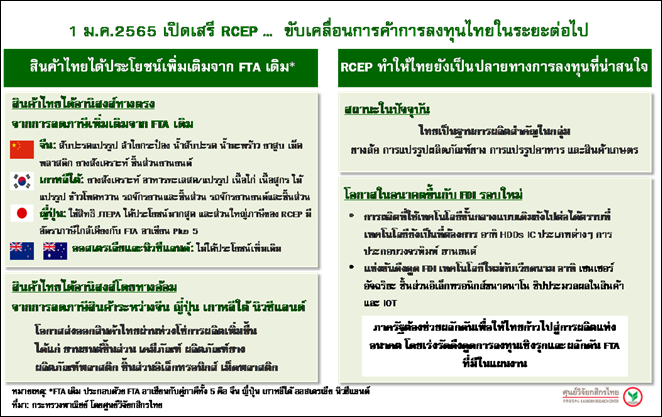 สำหรับไทย RCEP ช่วยให้ไทยมีโอกาสได้อานิสงส์เม็ดเงินลงทุนในอนาคตต่อยอดการผลิตที่ใช้เทคโนโลยีดั้งเดิมอย่าง HDDs IC การประกอบวงจรพิมพ์ และยานยนต์ แต่ไทยก็ต้องเผชิญการแข่งขันการดึงดูด FDI กลุ่มใหม่กับคู่แข่ง โดยเฉพาะการลงทุนในกลุ่มเทคโนโลยีที่เป็นหัวใจหลักที่จะช่วยยกระดับโครงสร้างการผลิตของไทยให้ก้าวไปสู่อุตสาหกรรม S-Curve อาทิ การผลิตเซนเซอร์อัจฉริยะ ชิ้นส่วนอิเล็กทรอนิกส์ขนาดนาโน ชิปประมวลผลในสินค้าและ IOT
