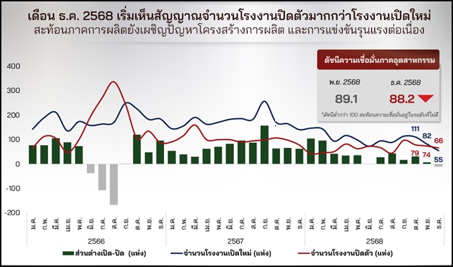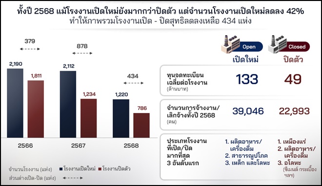 • ในเดือน ธ.ค. 2568 พบว่า จำนวนโรงงานปิดตัวกลับมามากกว่าโรงงานเปิดใหม่อีกครั้งในรอบ 2 ปีกว่า โดยทั้งปี 2568 แม้จำนวนโรงงานที่เปิดใหม่ยังมากกว่าโรงงานปิดตัว แต่จำนวนโรงงานเปิดใหม่ลดลง 42% จากปีก่อน