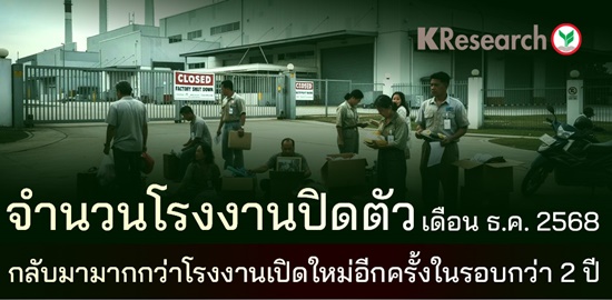 • ในเดือน ธ.ค. 2568 พบว่า จำนวนโรงงานปิดตัวกลับมามากกว่าโรงงานเปิดใหม่อีกครั้งในรอบ 2 ปีกว่า โดยทั้งปี 2568 แม้จำนวนโรงงานที่เปิดใหม่ยังมากกว่าโรงงานปิดตัว แต่จำนวนโรงงานเปิดใหม่ลดลง 42% จากปีก่อน
