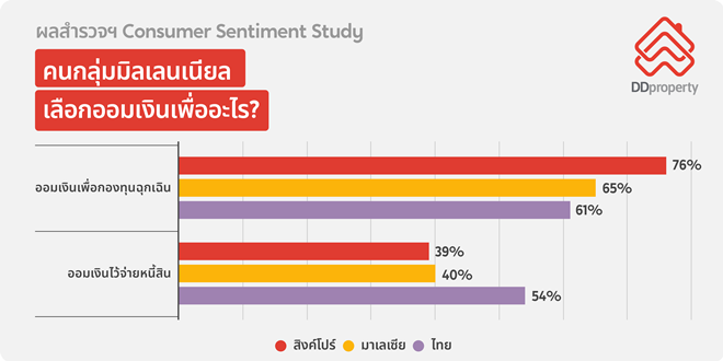 • ความมั่นคงคือคำตอบ ดันเทรนด์เงินฉุกเฉินมาแรง เมื่อพูดถึงการวางแผนการใช้จ่ายใน 1 ปีข้างหน้าของกลุ่มมิลเลนเนียลในอาเซียน พบว่าเทรนด์เงินสำรองฉุกเฉิน ซึ่งเป็นอีกทางเลือกการออมเงินในบัญชีออมทรัพย์ดอกเบี้ยสูงหรือกองทุนมาแรงอย่างเห็นได้ชัด สะท้อนให้เห็นว่าชาวมิลเลนเนียลได้เรียนรู้จากประสบการณ์ที่ต้องเผชิญการแพร่ระบาดฯ ทำให้หันมาสนใจวางแผนการเงินเพื่อเตรียมพร้อมรับมือเหตุฉุกเฉินที่อาจส่งผลกระทบต่อสภาพคล่องทางการเงินในอนาคตมากขึ้น กว่า 3 ใน 4 ของชาวสิงคโปร์ 76% วางแผนเก็บเงินไว้เป็นเงินสำรองฉุกเฉิน ตามมาด้วยเก็บเงินไว้ชำระหนี้ (39%) และนำไปใช้เพื่อท่องเที่ยวในวันหยุด (35%) ด้านชาวมาเลเซีย 65% ให้ความสนใจในการเก็บเงินเพื่อสร้างกองทุนฉุกเฉินมาเป็นอันดับแรกเช่นกัน อย่างไรก็ดี ครึ่งหนึ่ง (50%) เผยว่าจะนำเงินไปซื้อที่อยู่อาศัย และ 40% ต้องการนำเงินไปใช้หนี้ที่ค้างอยู่ ในขณะที่แผนการใช้จ่ายของชาวไทยยังคงให้ความสนใจไปที่การบริหารจัดการเงินให้เกิดประสิทธิภาพสูงสุดผ่านการสร้างกองทุนฉุกเฉิน 61% ตามมาด้วยนำเงินไปใช้จ่ายภายในครอบครัวในสัดส่วนไล่เลี่ยกันที่ 60% และเลือกเก็บเงินไว้ชำระหนี้ที่ค้างอยู่ 54% สะท้อนให้เห็นภาระหน้าที่ของผู้บริโภคในช่วงวัยนี้ที่มีบทบาทในการบริหารจัดการสภาพคล่องทางการเงินของครอบครัวและรับผิดชอบค่าใช้จ่ายส่วนอื่นมากขึ้น