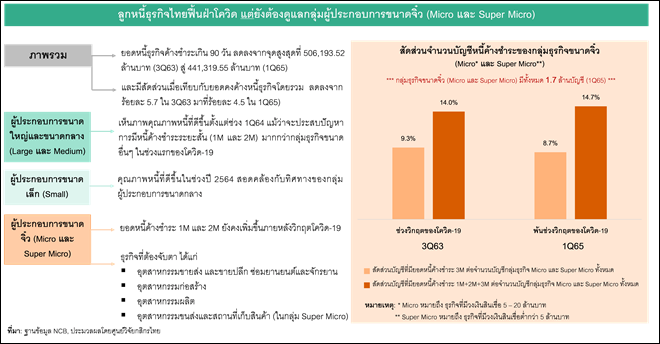 – จากการศึกษาและประมวลผลข้อมูลบัญชีลูกหนี้ธุรกิจของบริษัท ข้อมูลเครดิตแห่งชาติ จำกัด (NCB) พบว่า แม้จะพ้นช่วงวิกฤตจากไวรัสโควิด-19 และเศรษฐกิจกิจกำลังทยอยฟื้นตัว แต่กลุ่มธุรกิจขนาดจิ๋วอย่างไมโครและซุปเปอร์ไมโครยังเป็นกลุ่มที่เปราะบางต่อการฟื้นตัว