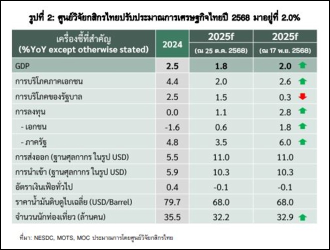 ศูนย์วิจัยกสิกรไทย ปรับเพิ่มประมาณการเศรษฐกิจไทยปี 2568 เป็น 2.0% จากเดิมที่ 1.8% โดยมอง GDP ไตรมาส 4/2568 จะขยายตัวราว 0.8% YoY แทนที่จะหดตัวเล็กน้อยตามที่ประเมินก่อนหน้า สาเหตุหลักมาจากมาตรการกระตุ้นเศรษฐกิจ การเร่งเบิกจ่ายงบประมาณ และจำนวนนักท่องเที่ยวต่างชาติที่สูงกว่าที่คาดไว้ ส่งผลให้เศรษฐกิจไทยยังไม่เข้าสู่ภาวะถดถอยทางเทคนิค