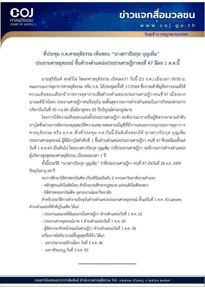 โดยการให้ความเห็นชอบแต่งตั้งประธานศาลฎีกา จะพิจารณารายชื่อผู้พิพากษาตามลำดับอาวุโสซึ่งผ่านการคัดกรองคุณสมบัติความเหมาะสมตามบัญชีที่มีการเสนอจากอนุกรรมการตุลาการ ศาลยุติธรรม หรือ อ.ก.ต. ซึ่งที่ประชุม ก.ต.วันนี้ มีมติเห็นชอบให้ นางสาวปิยกุล บุญเพิ่ม ประธานศาลอุทธรณ์ ผู้ที่มีอาวุโสลำดับที่ 1 ขึ้นดำรงตำแหน่งประธานศาลฎีกา คนที่ 47 ซึ่งจะมีผลตั้งแต่วันที่ 1 ต.ค.64 เป็นต้นไป โดยนางสาวปิยกุล บุญเพิ่ม ว่าที่ประธานศาลฎีกา จะมีวาระการดำรงตำแหน่งผู้บริหารสูงสุดของศาลยุติธรรม เป็นระยะเวลา 1 ปี